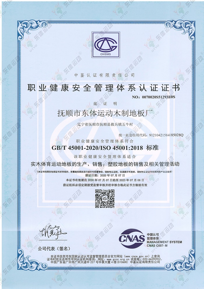 “東體運動”木地板系列產品已經通過國際籃聯檢測、世界羽聯認證、歐盟體育地板專項標準CE認證、歐盟環保產品CE認證、FSC世界森林協會認證、五星級售后服務企業認證等,是中國職業籃球俱樂部遼寧沈陽三生飛豹籃球俱樂部官方合作伙伴,內蒙古籃球協會戰略合作伙伴。